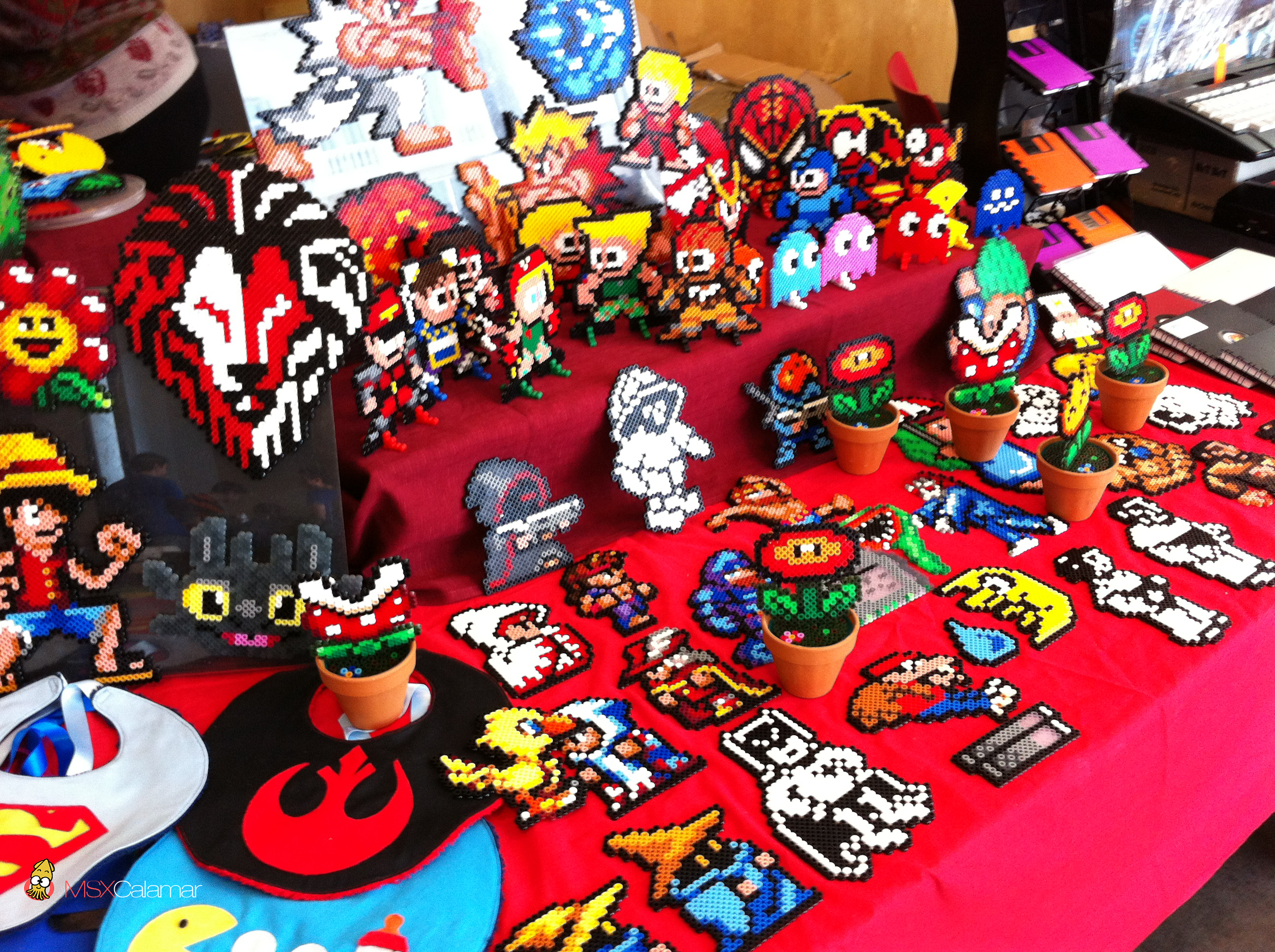 Nuevo stand de merchandising especializados en manualidades geek relacionadas con juegos clásicos, con figuras en hamabeads montados en distintos soportes, chapas o cajitas.